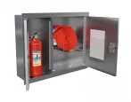 Шкаф пожарный ШПК-315 ВО из нержавеющей стали – предназначен для размещения и хранения рукава пожарного в сборе, пожарного вентиля (клапана) и одного огнетушителя до 5 литров. Шкаф оборудован кассетой (турелью) для пожарного рукава.