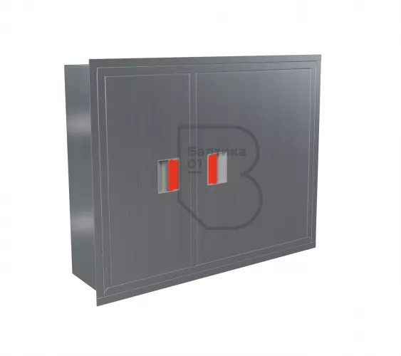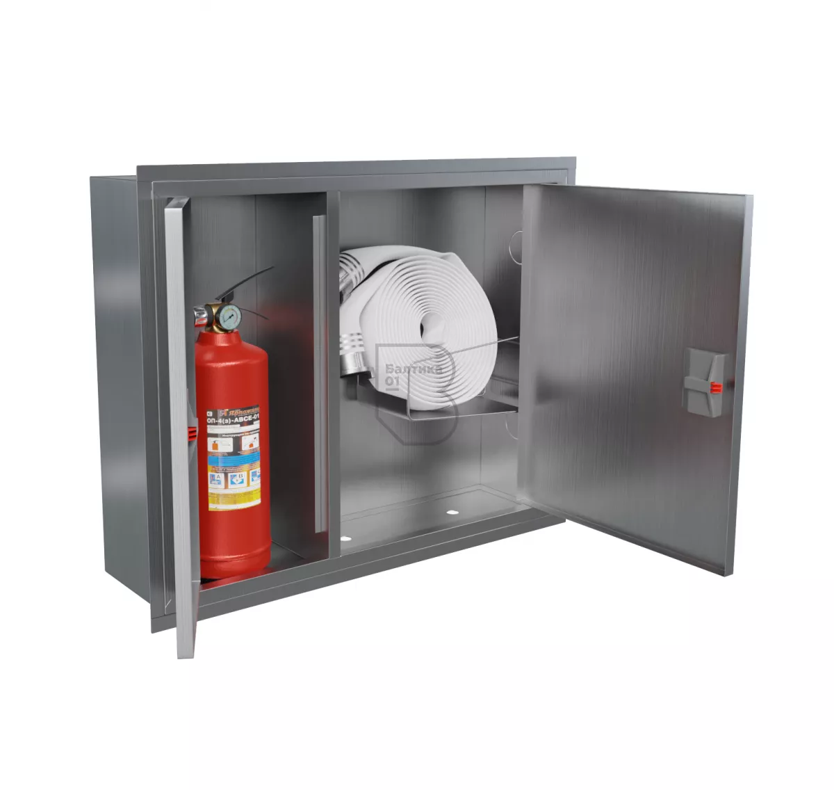 Дверцы пожарного шкафа открываются на 160 градусов. Имеют запорное устройство в виде пластиковой защелки.