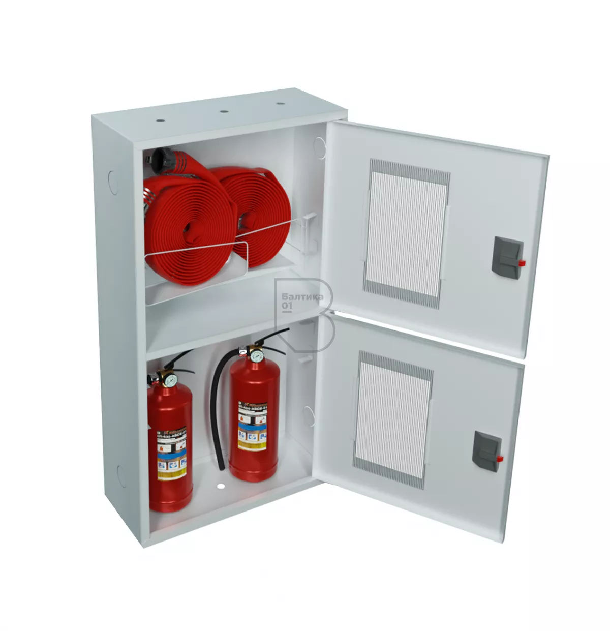 Шкаф ШПК-320-12 НОБ имеет в верхнем отсеке две кассеты (корзины), что позволяет подсоединять два крана с обеих сторон. Нижний отсек предназначен для хранения двух огнетушителей до 10 кг. Дверцы пожарного шкафа открываются на 160 градусов. Имеют запорное устройство в виде пластиковой защелки. На каждой дверце имеется смотровое окно со вставкой из поликарбоната.